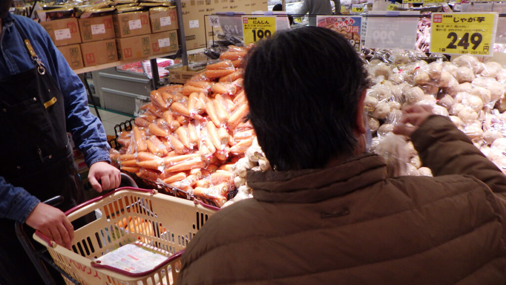 スーパーの中では、買い物カートを押しながら、夕食に必要な食材を一緒に選んでいきます。