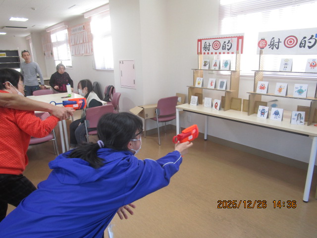 イントロ当てクイズや、箱の中に手を入れて中身を当てるゲーム、喜楽里まつりでも使用した射的の的当てゲームを、チーム対抗戦で実施しました。