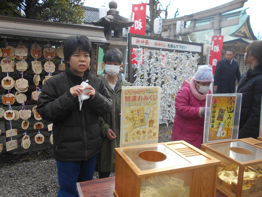 1月5日が仕事始めだったため、施設の近くにある白髭神社へ初詣に行ってきました。参拝後にはおみくじを引き、結果に一喜一憂する姿も見られました。新年早々、気持ちを新たに仕事に取り組もうとする利用者さんの姿が印象的でした。